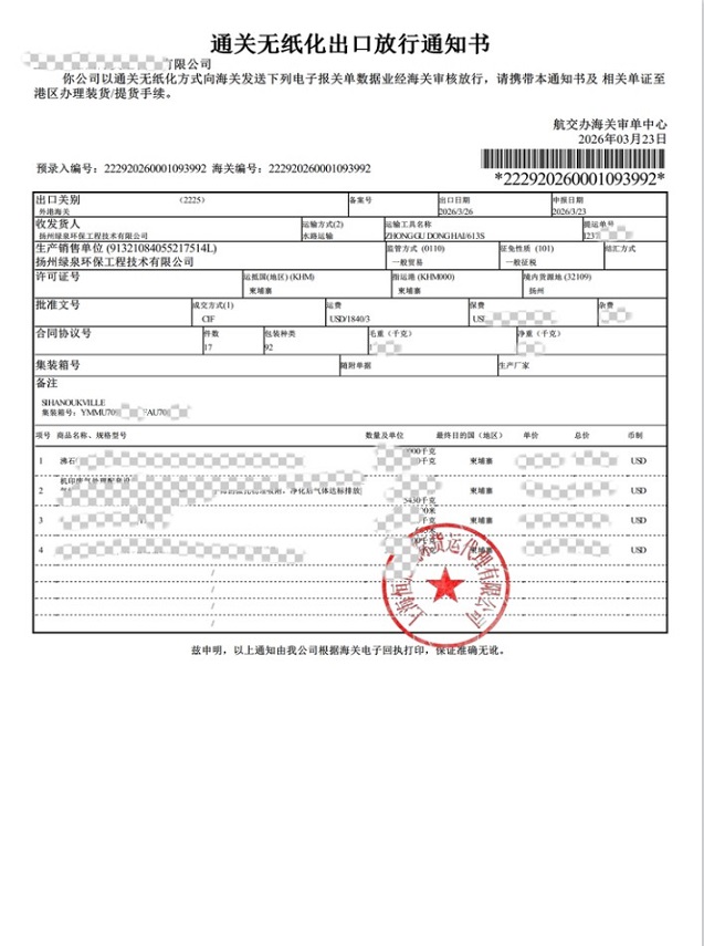 وبحسب ما ورد، كان الجدول الزمني لهذا التسليم ضيقًا وعالي الكفاءة. وفي يوم 22، تم التقاط المعدات بنجاح وتحميلها على الفور على متن سفينة في نفس اليوم. بعد ذلك، أبحرت الحاملة بنجاح في اليوم السادس والعشرين، ونقلت المعدات إلى كمبوديا عبر الممر المائي. لا يُظهر هذا التسليم قدرات التنفيذ عالية الكفاءة لشركة Lvquan Environmental في إدارة الخدمات اللوجستية عبر الحدود فحسب، بل يُظهر أيضًا مكانتها التكنولوجية الرائدة في مجال معالجة غاز النفايات الصناعية لصناعة الطباعة.